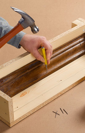 3. Add trim or other elements as desired for custom shaping effects. Here, we used crown molding, which we fastened to the blocking with finish nails using a nail set. Cover the screw heads on the inside of the mold with silicone caulk: then flatten to create a smooth, flat surface.