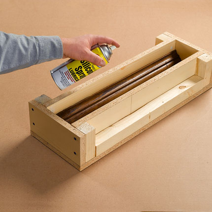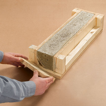 1. Cut the pieces for the mold. Fasten the end blocking pieces flush with the ends of the side panels using pairs of 2" drywall screws driven through pilot holes. Fasten the bottom blocking to the side panels, flush along the bottom edges.