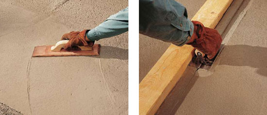 3. Float the concrete surface to create a surface that is both smooth and skid resistant. Wait until bleed water has disappeared before proceeding. Finish options include a broomed finish, a smooth steel-trowel finish or seed with small aggregate after floating.