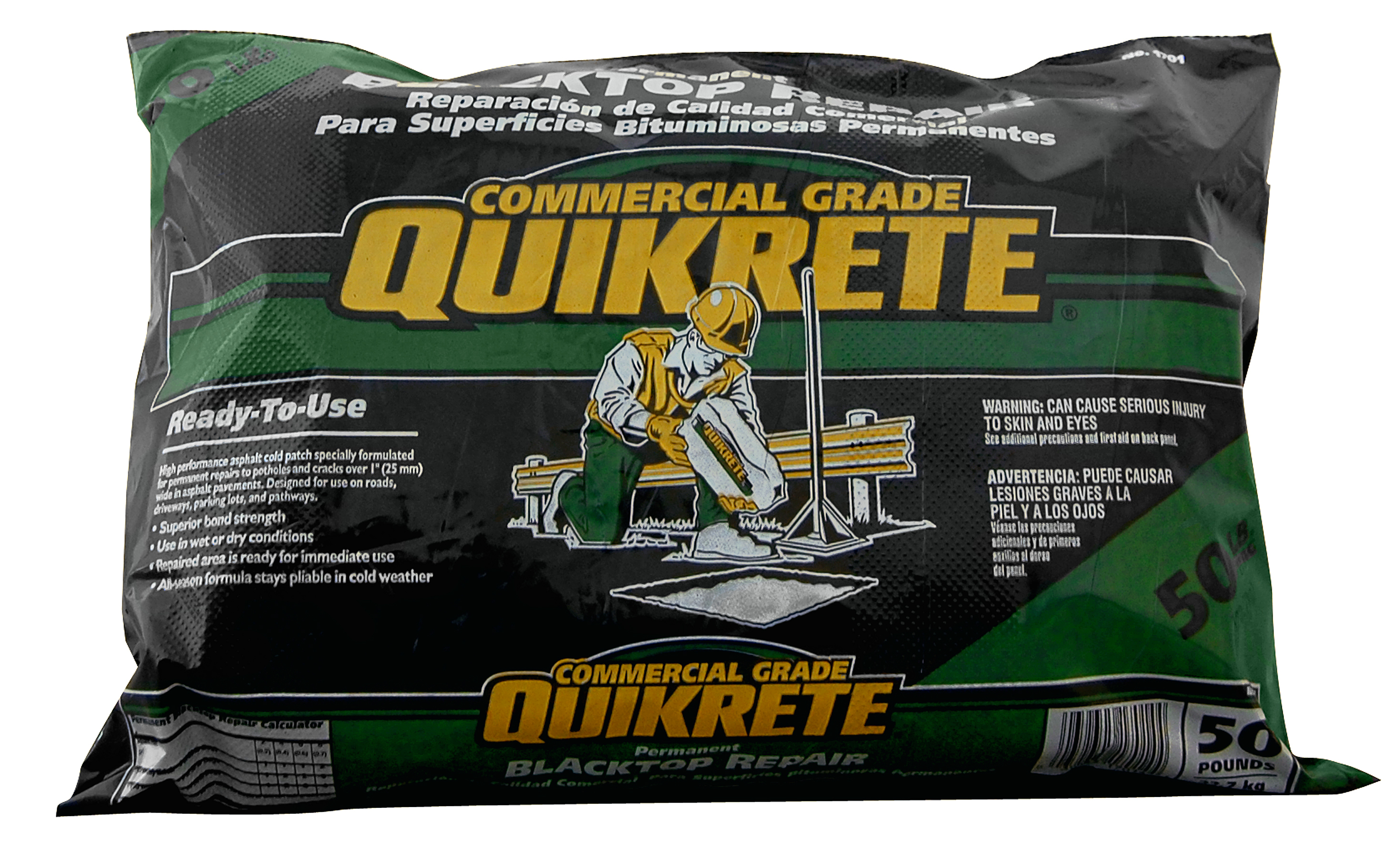 QUIKRETE® High Performance Blacktop Repair (No. 1701) is a specifically formulated high performance asphalt cold patch material for repairing potholes and cracks over 1" (25.4 mm) wide in asphalt pavements. It is suitable for use on roads, driveways, parking lots, and walkways. All-season formulation is suitable for making permanent repairs in wet or dry conditions.