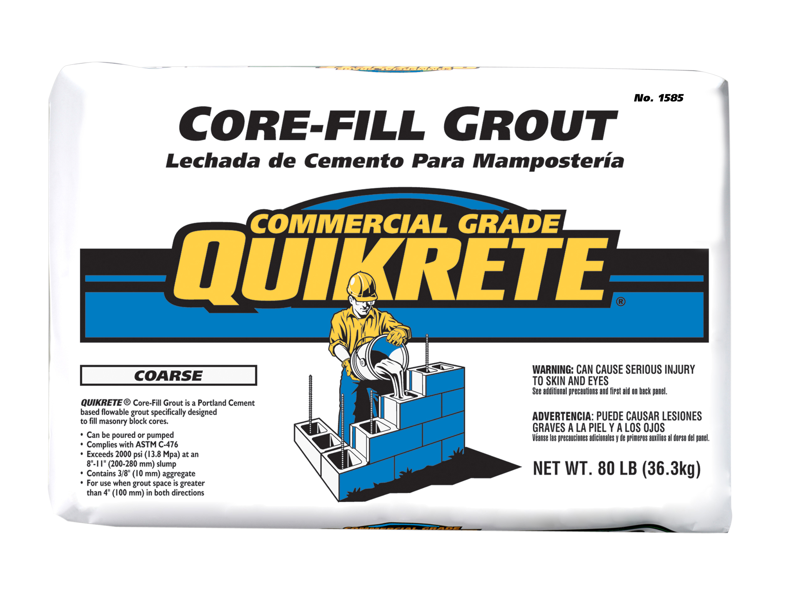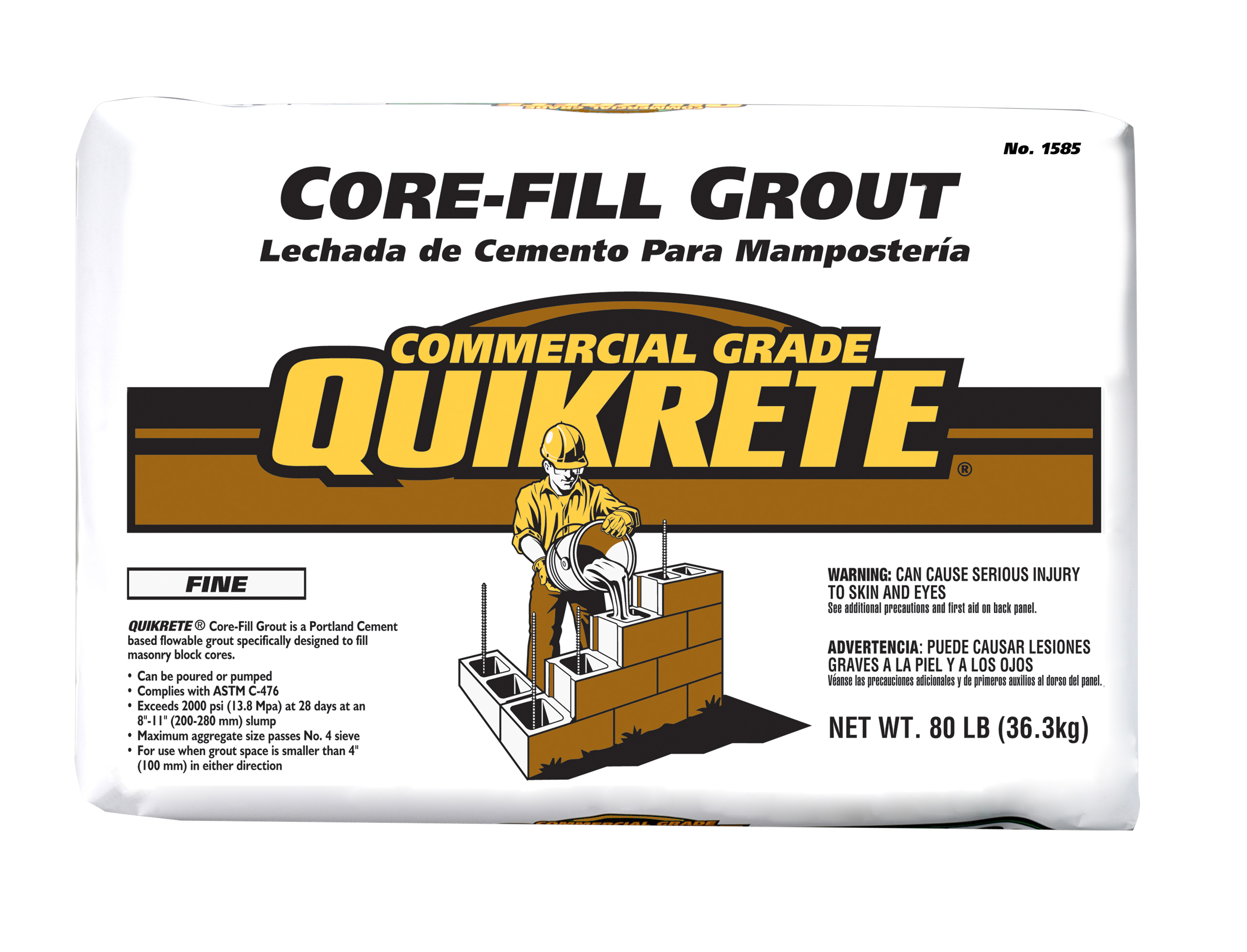 QUIKRETE® Core-Fill Grout (No. 1585-07, 1585-08) is a properly proportioned mixture of portland cement, graded sand, and other ingredients designed to provide a flowable grout requiring only the addition of water. Meets and exceeds the performance requirements of ASTM C476 for masonry grouts.