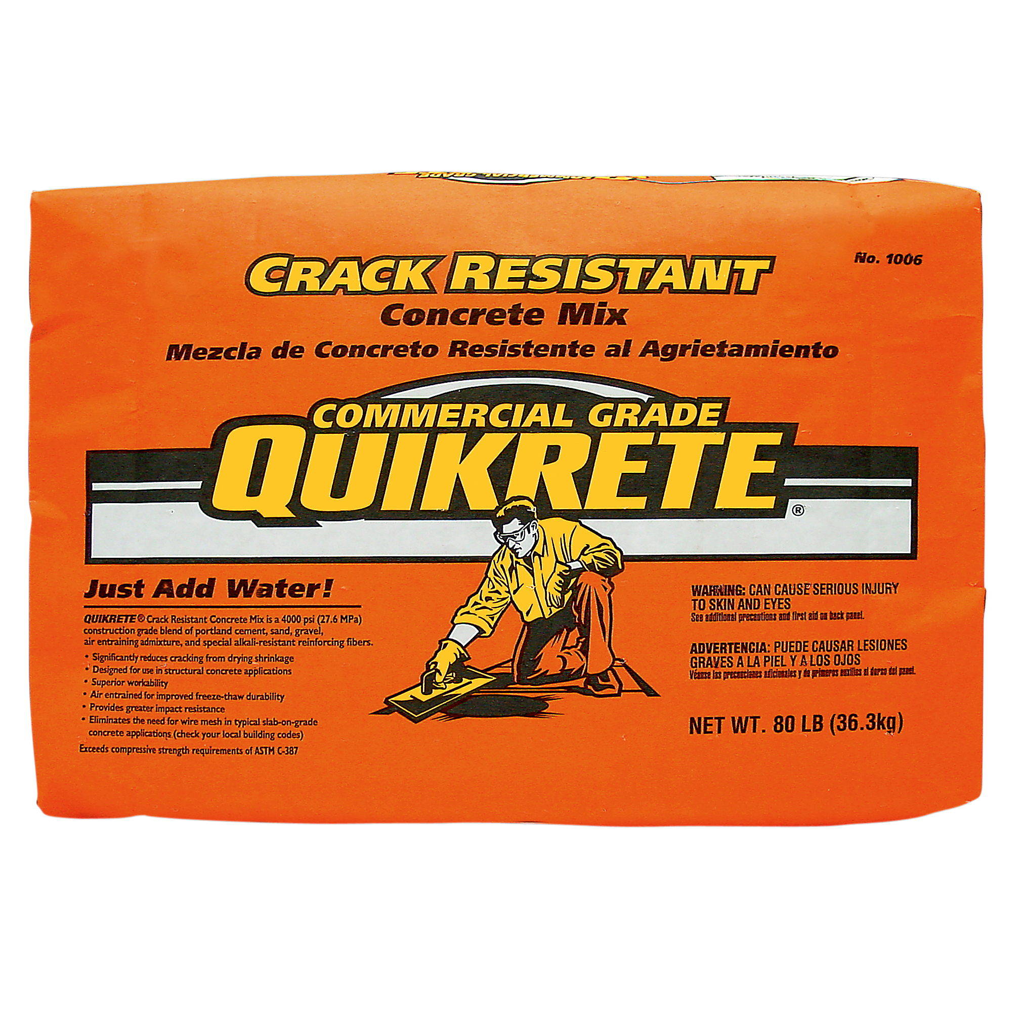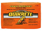 QUIKRETE® Crack Resistant Concrete Mix (No. 1006-80) is a 4000psi (27.5 MPa) blend of properly proportioned stone or gravel, sand, Portland cement, special synthetic fibers and other ingredients approved for use in concrete. The synthetic fibers eleminate the need for wire mesh in slab-on-grade construction. Exceeds the compressive strength requirements of ASTM C387.