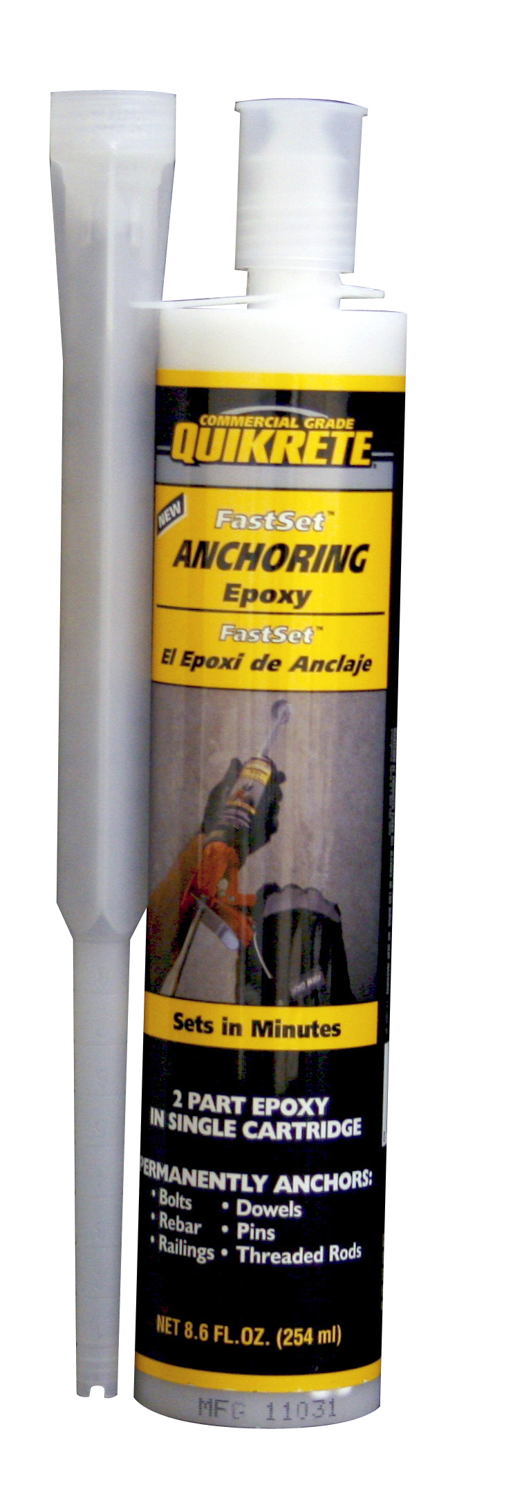 QUIKRETE® FastSet™ Anchoring Epoxy (No. 8620-30) is a commercial grade, fast Setting, two component structural epoxy with a gel time of 10-11 minutes. Non-sag, solvent-free, low odor formula. Concrete gray color.
