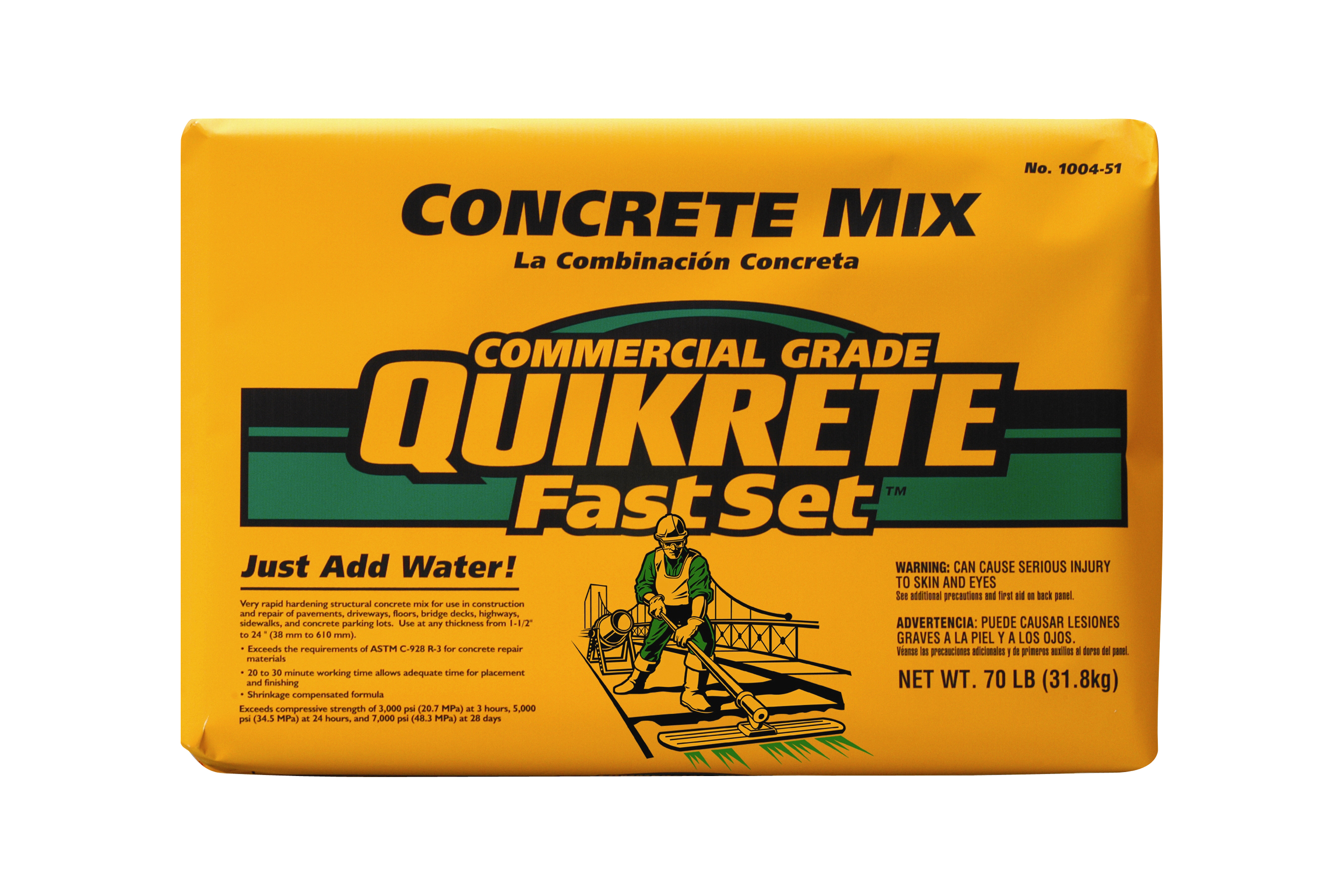 QUIKRETE® FastSet™ Concrete Mix (No. 1004) is a special blend of cement with specifically graded fine & coarse aggregates. Sets in 20-30 minutes allowing time for mixing, pouring and finishing. Use at any thickness from 1 1/2" (3.8 cm) to 24" (61 cm). Exceeds the requirements of ASTM C 928 R-3.