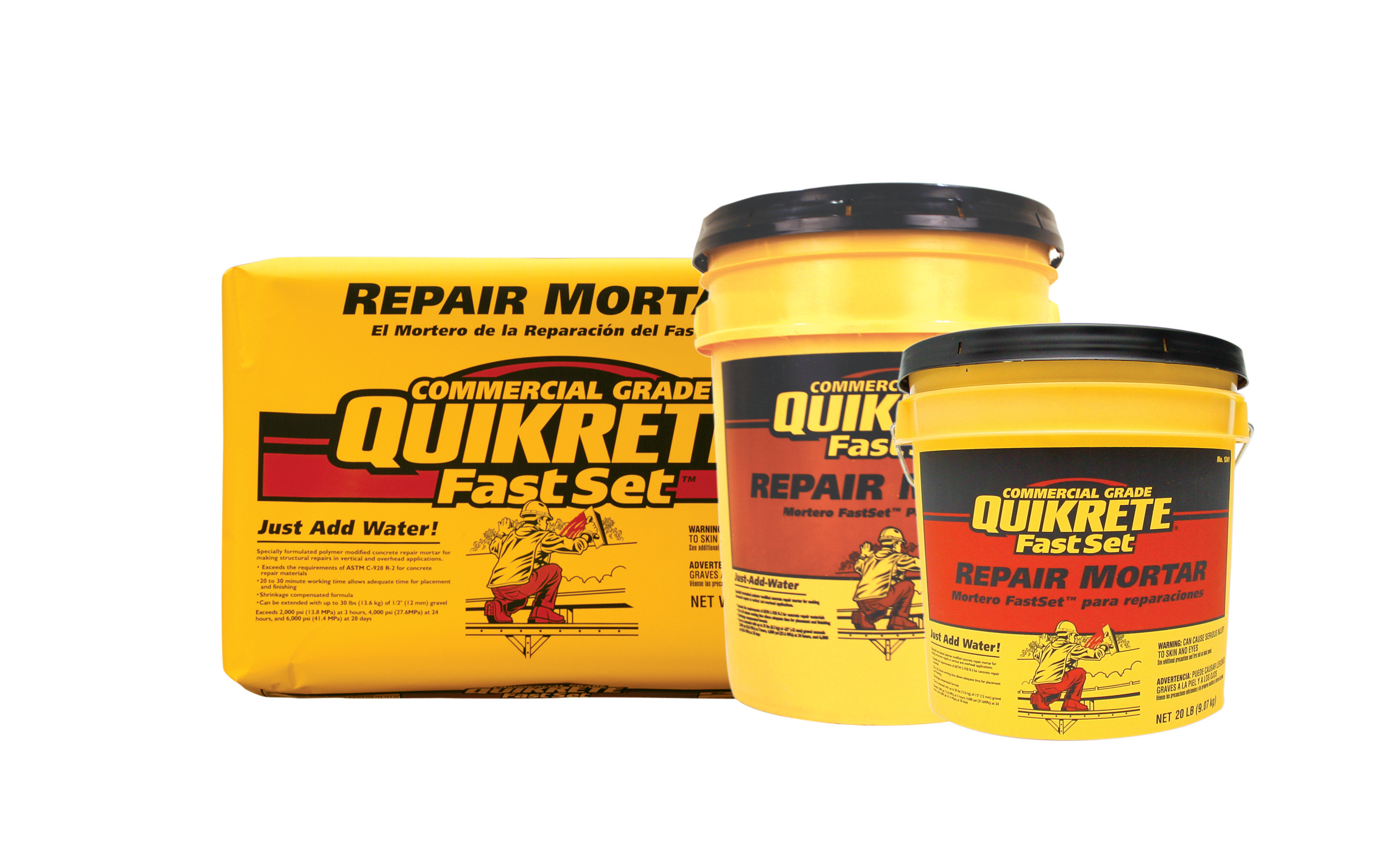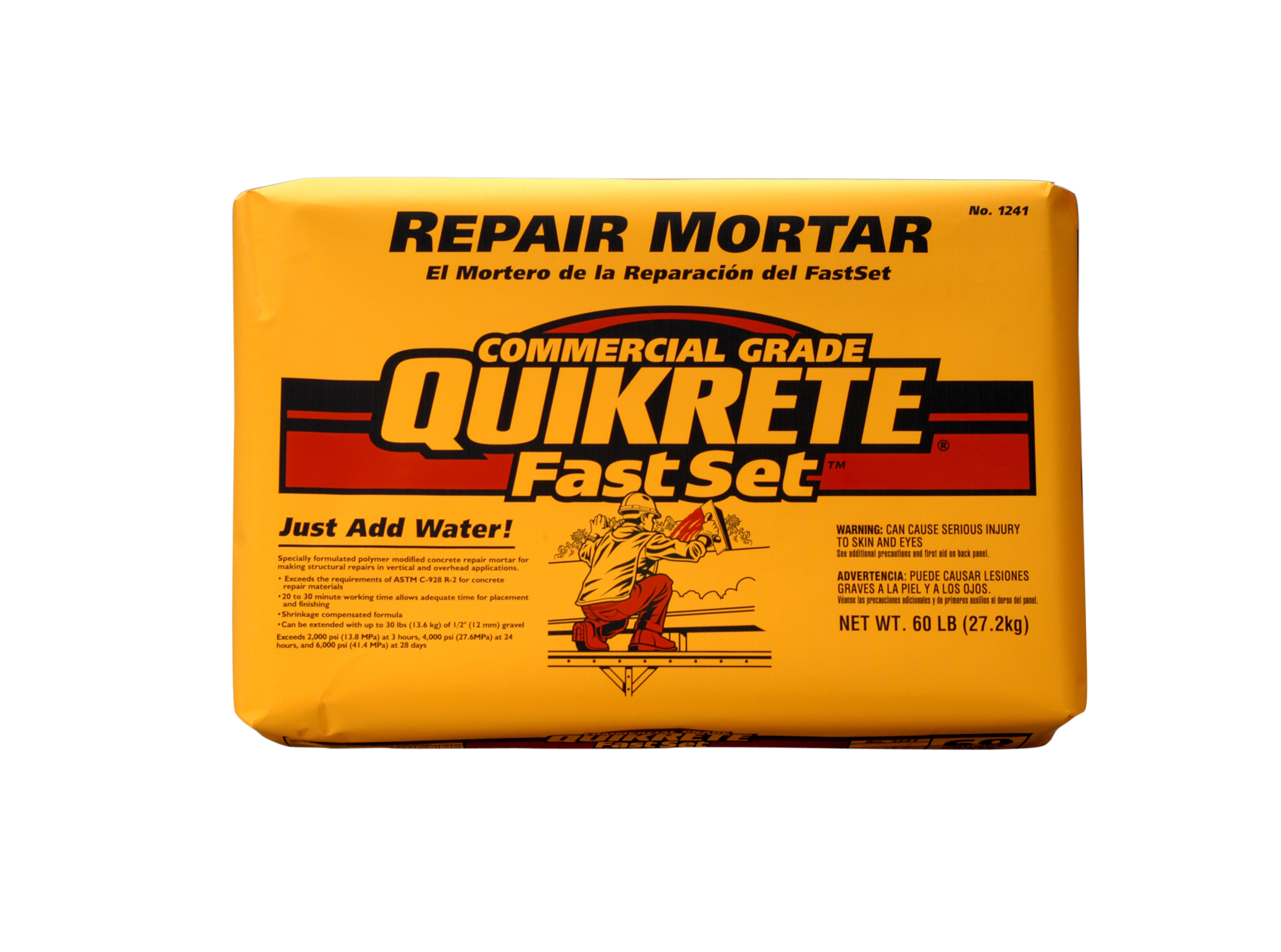 QUIKRETE® FastSet™ Repair Mortar (No. 1241) is specifically formulated to make structural repairs to any concrete, masonry or stucco surface. Low sag formula makes it ideal for vertical and overhead repairs. 20-30 minute working time and unique properties allow sculpting of the material during placement. Exceeds ASTM C 928 R-2.