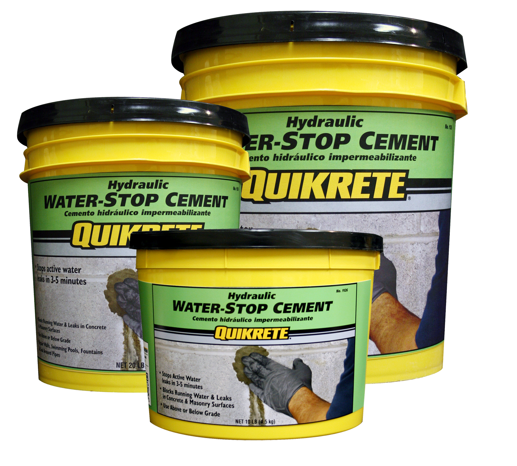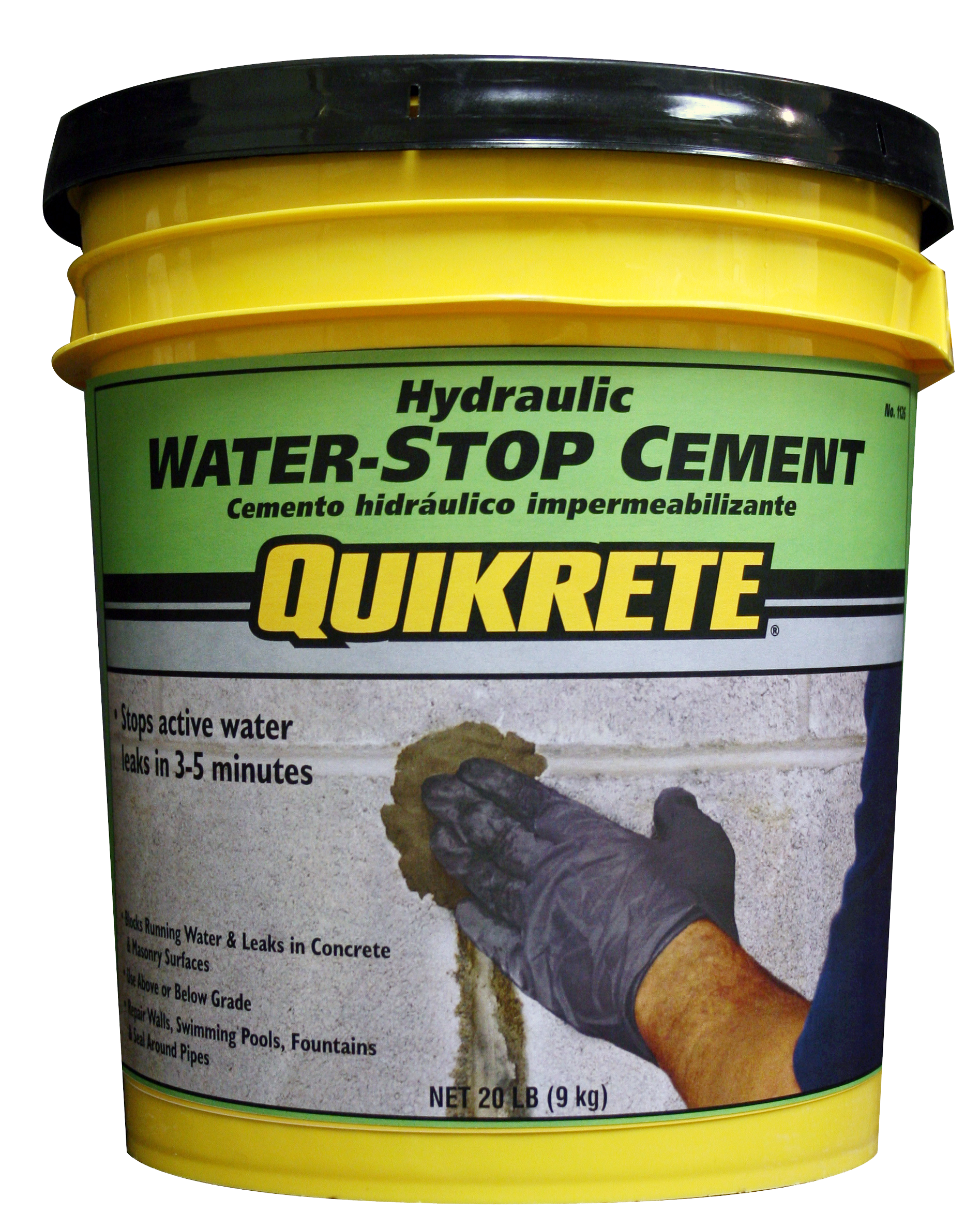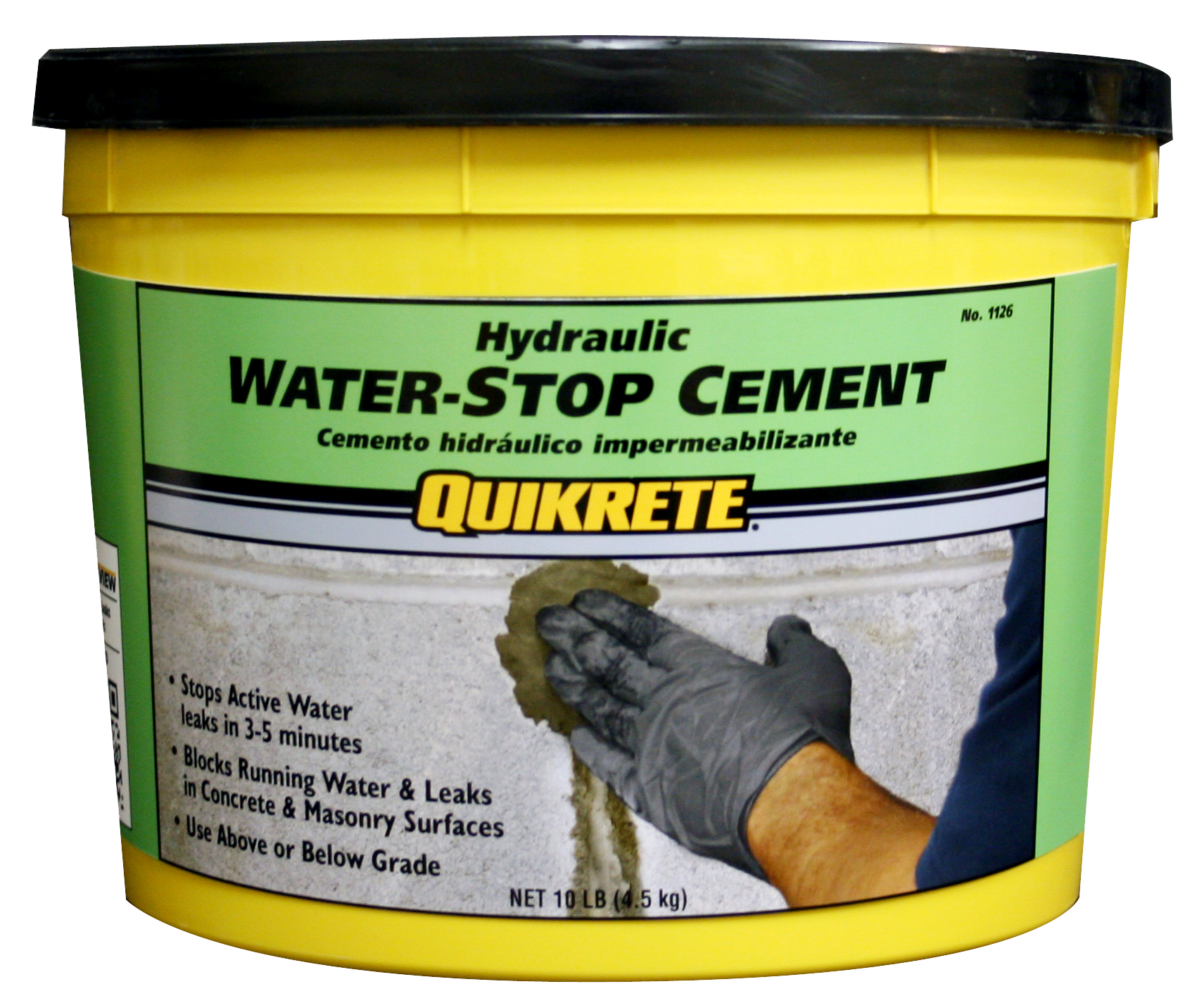 QUIKRETE® Hydraulic Water-Stop Cement (no. 1126) is a rapid setting, high strength repair material designed to plug leaks instantly in concrete and masonry. Sets in 3-5 minutes and can be used above and below grade.