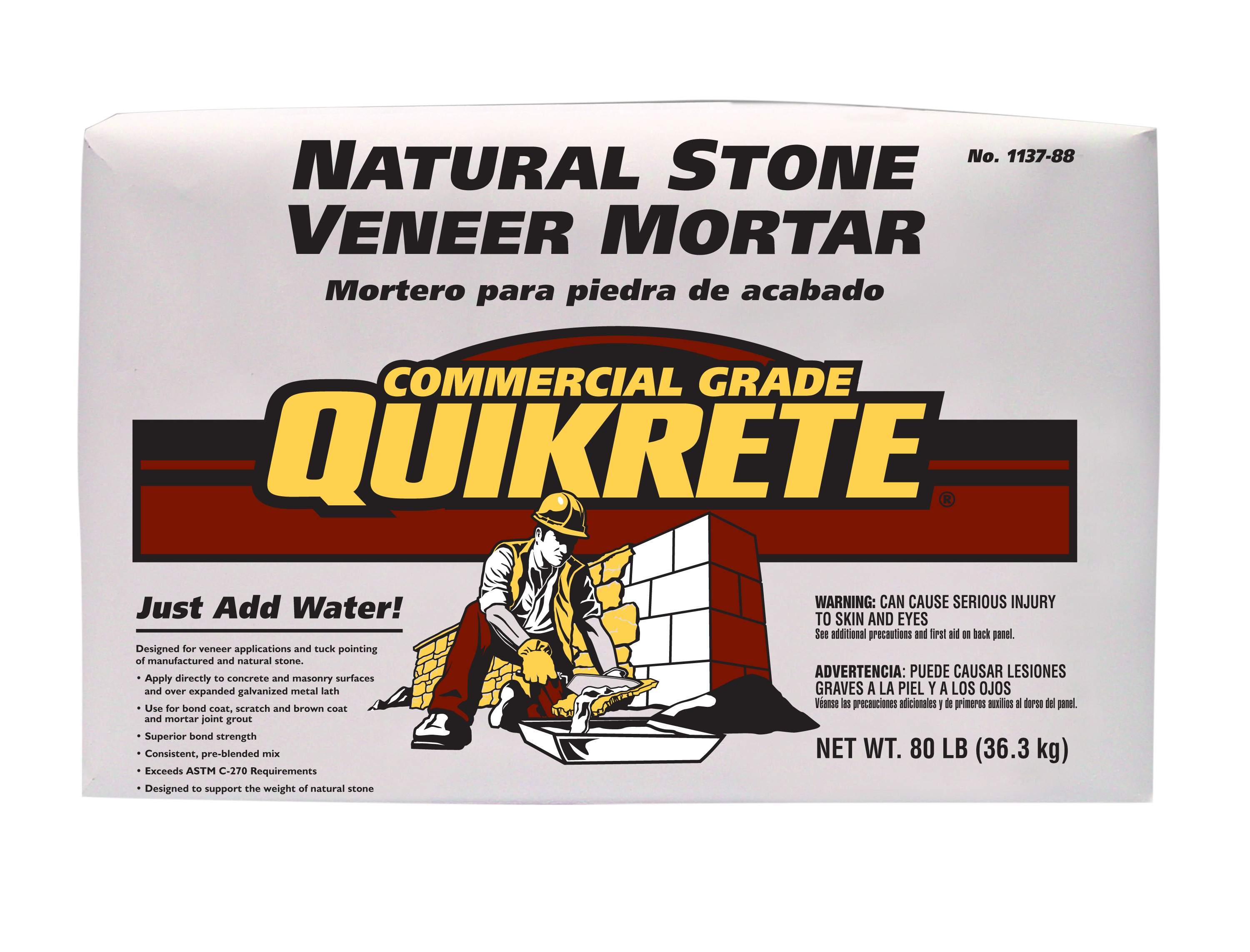 QUIKRETE® Natural Stone Veneer Mortar (No. 1137-88) is a contractor-grade mortar mix designed for veneer applications and tuck pointing of natural stone. QUIKRETE® Natural Stone Veneer Mortar can be used as a bond coat, scratch and brown coat and as a mortar joint grout over concrete and masonry surfaces or galvanized, expanded metal lath.