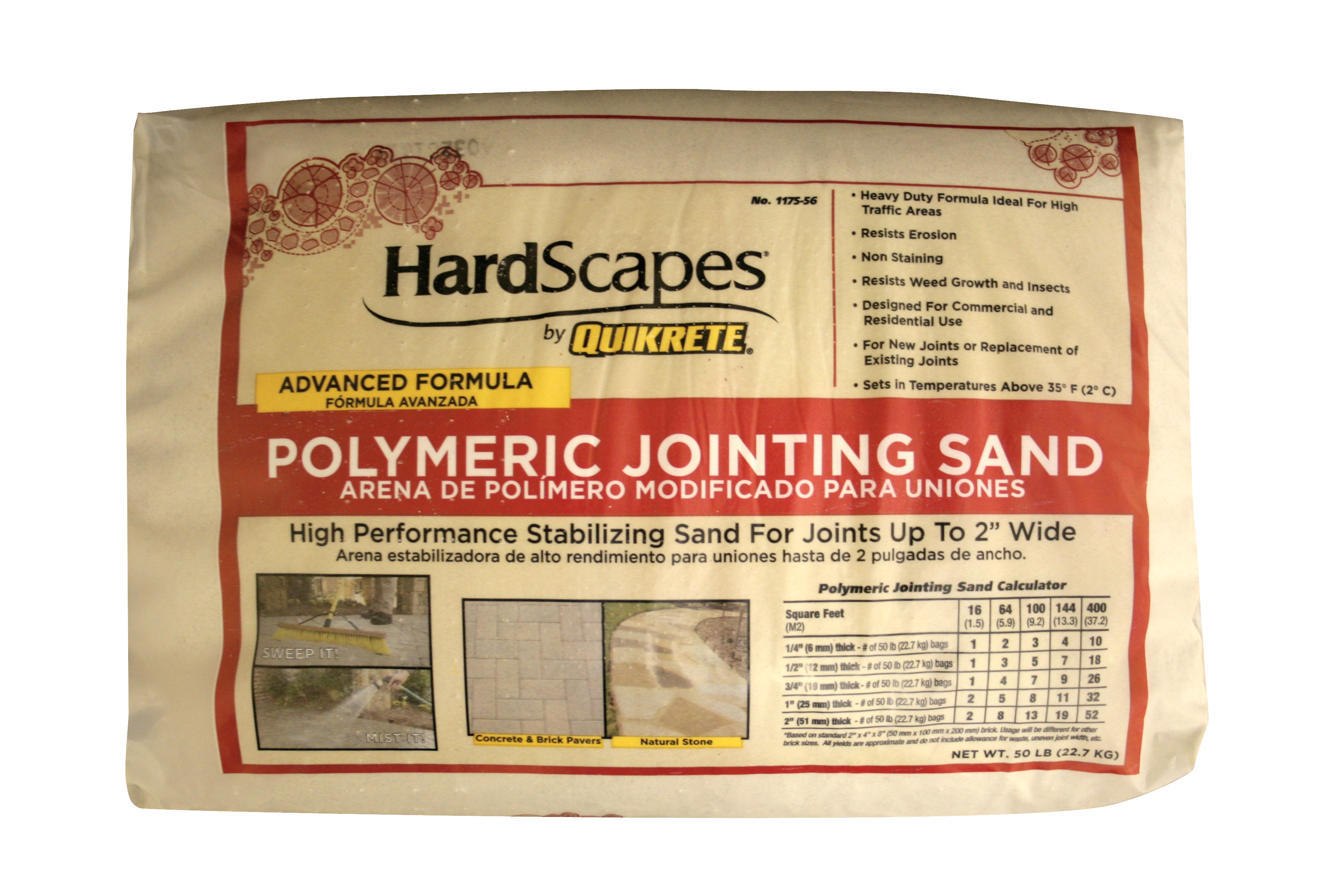 QUIKRETE® HardScapes Polymeric Jointing Sand (No. 1175-56) is a polymer-modified graded sand for filling joints up to 2” wide between interlocking pavers, brick, natural stone and concrete slabs. Simply sweep the sand into the joints and saturate with a water mist. The polymer modified sand hardens as it dries and resists erosion, weed growth and insects.