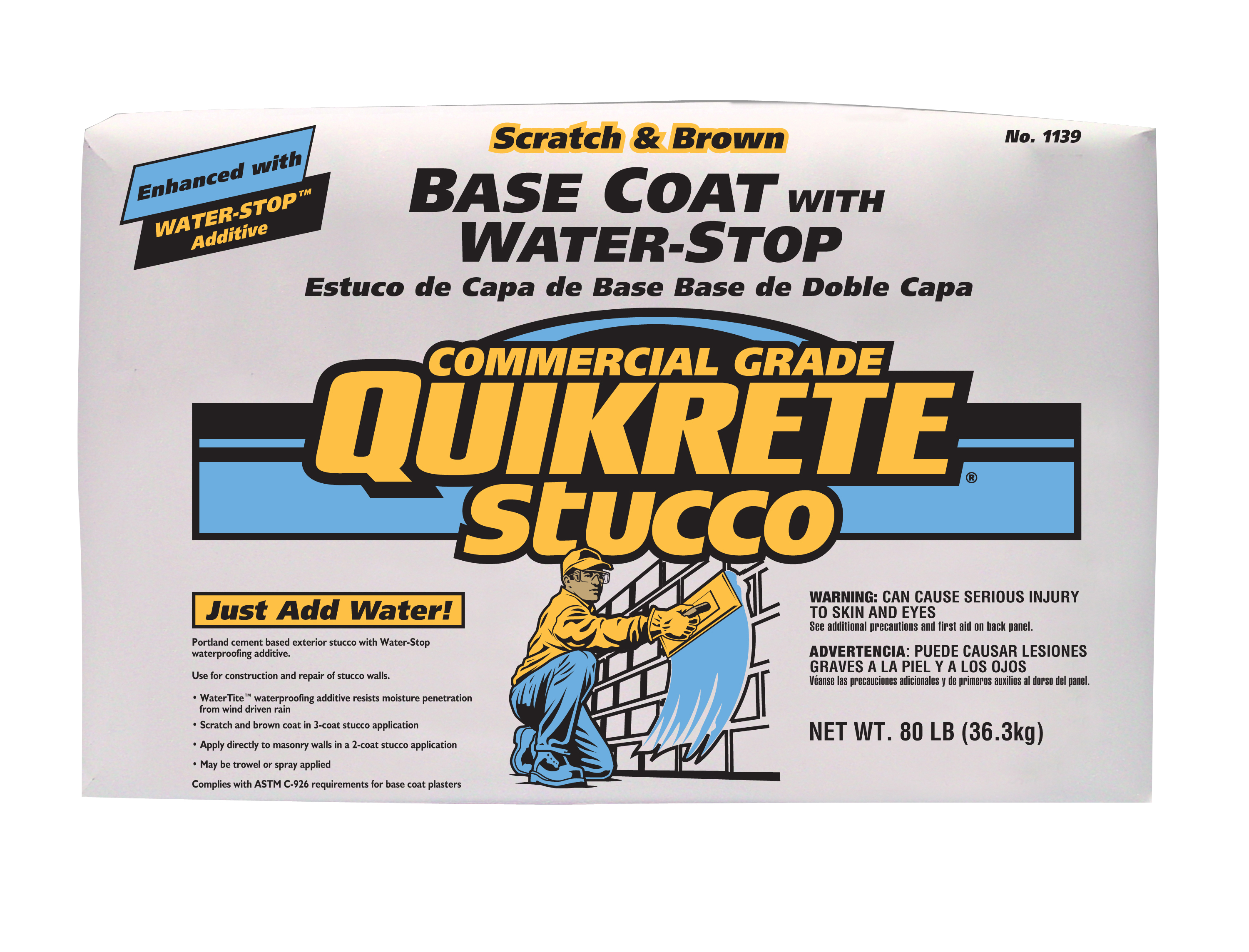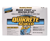 QUIKRETE® Base Coat Stucco with Water-Stop (No. 1139-89) is a portland cement based exterior stucco, with Water-Stop additive, used for the construction and repair of stucco walls. The Water-Stop additive retards the penetration of water from winddriven rain.