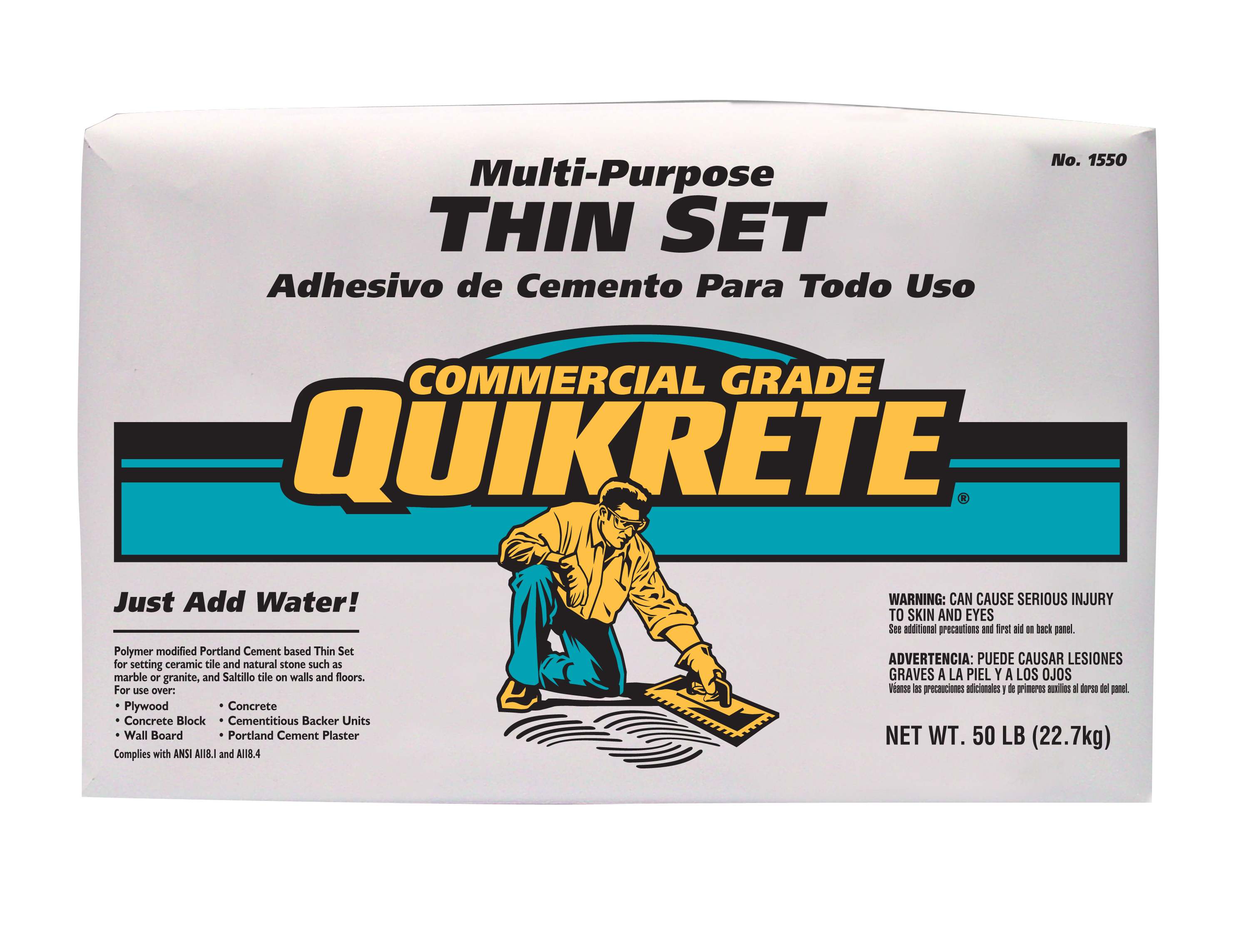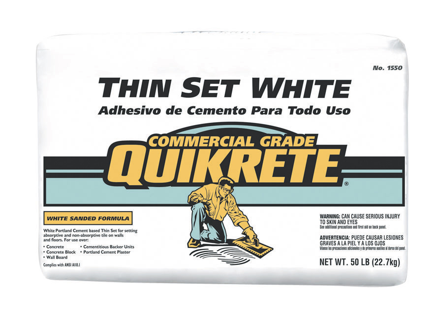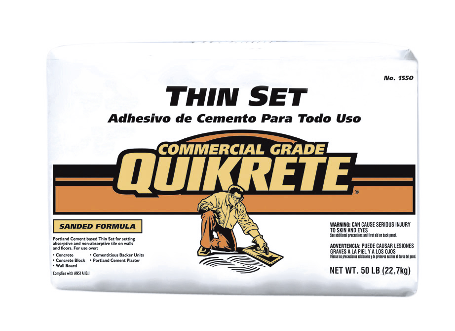 QUIKRETE® Thin Set™ Sanded (No. 1547) is a blend of portland cement, sand, and chemical additives. Addition of Acrylic Fortifier or Latex is recommended.