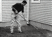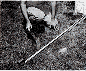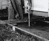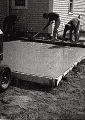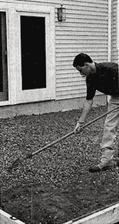 | 1. Stake out the area for the walk or slab, using a T square, measuring tape and twine. Use a line level to ensure proper placement and slope of lines. |