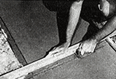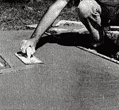 | 5. Float the concrete surface smooth, using a wooden or metal float or darby. Swing the tool in circles, holding the leading edge of the tool up slightly to keep it from digging into the concrete. Float the entire slab. Stop floating when the entire slap in fairly smooth and the float leaves not visible marks. All stone and gravel in the mix should have been worked below the surface. |