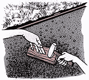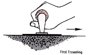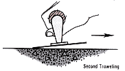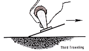 For very smooth surfaces, additional trowelings are necessary. On the second troweling, hold the leading edge up slightly and press down a bit harder. Repeat the process used in the first troweling. The third troweling should produce an almost glossy finish. Hold the leading edge up further, press down harder, and repeat the troweling process.