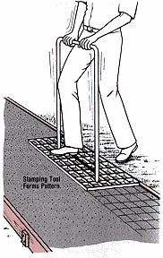 Grooved and stamped finishes are produced by pressing masonry stamping tools and other objects into slightly stiff concrete. Stamping tools available at most large rental centers can be used to imprint simulated paving brick, stone, tile and other patterns. Small coarse aggregate such as pea gravel should be placed in the concrete prior to the stamping. After the surface has been floated and troweled, simply step on the pad to stamp the design to a depth of about 1".