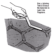 A piece of bent pipe works particularly well for making deep, clean grooves and a jointer can be used to groove the concrete to look like flagstone. Scoring must be done when the concrete has partially set. For a unique finish, create your own homemade stamp using typical household items such as cookie cutters.