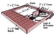 3. Use 5/8" exterior-grade plywood and 2" x 2" wood and cleats to construct the sandbox frame according to the dimensions shown in the illustration. Border the frame with 1" x 3" trim.