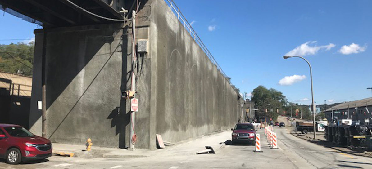 Originally a wood trestle built in 1897, the Braddock Viaduct was converted into a concrete bridge by the Union Railroad in 1914. In service for more than 100 years, concrete arches along four blocks of the Braddock Viaduct were rehabilitated with QUIKRETE® Shotcrete MS – Fiber Reinforced by Mosites Construction. The loose and deteriorated concrete was removed with a jackhammer to prepare the surface before shotcrete was applied from 4” thick to 2’ deep to make the repairs. Silos were used on the jobsite to consistently and efficiently mix, pump and apply the shotcrete 100 feet in the air.