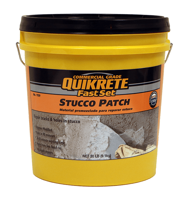 QUIKRETE® FastSet® Stucco Patch (No. 1139-92) is a fast-setting, Portland cement-based stucco patching material formulated to provide water repellency, minimal shrinkage and improved durability. FastSet® Stucco Patch can be used for partial-depth and full-depth stucco repairs. FastSet® Stucco Patch has a working time of 20-30 minutes and can be painted after 90 minutes.