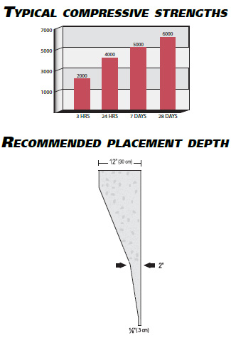 For patches deeper than 2 in (50 mm), High Performance Cement FastSet™ Repair Mortar may be extended with 27.5 lb (12.4 kg) of high quality minus 1/2 in (minus 13 mm) aggregate per 55 lb (24.9 kg) bag.