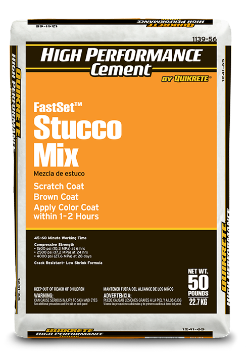 Coverage: Each 50 lb (22.7 kg) bag of High Performance Cement FastSet™ Stucco Mix will yield approximately .5 cu ft (14.2 L) of mixed plaster.
