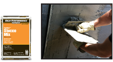 High Performance Cement FastSet™ Stucco Mix is a fast-setting, polymer modified fiber reinforced cement-based stucco designed for use as the scratch and/or brown coat in a 3-coat stucco application, or the first coat in a 2-coat application. High Performance Cement FastSet™ Stucco Mix has a working time of 20-30 minutes and is formulated to provide minimal shrinkage, crack resistance, high compressive strengths and improved durability.