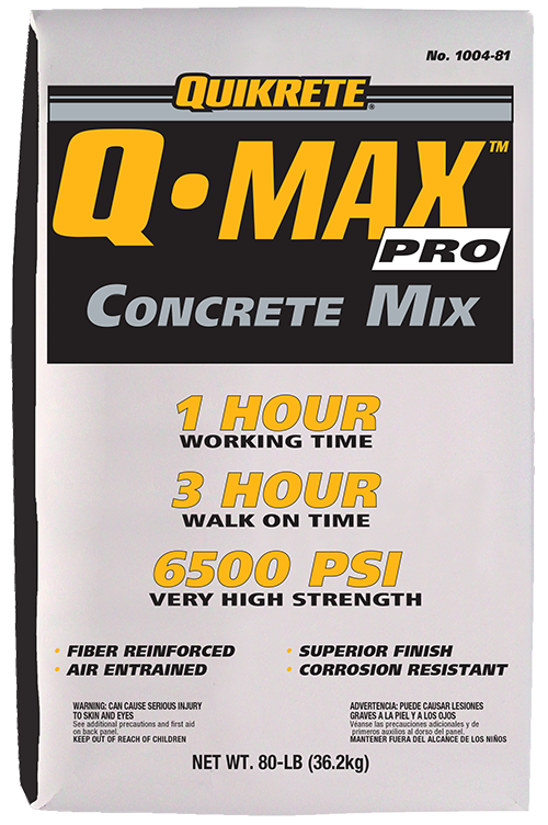 QUIKRETE® Q•Max Pro Concrete Mix (No. 1004-81) is a fiber reinforced, rapid hardening concrete formulated to provide a 1-hour working time, a walk-on time of 3 hours and achieve a compressive strength of 6500 PSI (44.8MPa). The mix provides superior workability and finishing characteristics and resists drying shrinkage cracks. QUIKRETE® Q•Max Pro Concrete Mix is air entrained for improved freeze-thaw durability and contains a corrosion inhibitor to protect reinforced steel from the effects of chloride and de-icing materials.