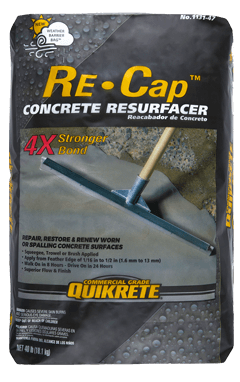 Re-Cap™ Concrete Resurfacer (No. 1131-47) is a special blend of Portland cement, sand, polymer, and other additives designed to provide a shrinkage compensated repair material. QUIKRETE® Re-Cap® Concrete Resurfacer is designed to provide a new, durable, and wear-resistant surface over worn or scaled concrete.