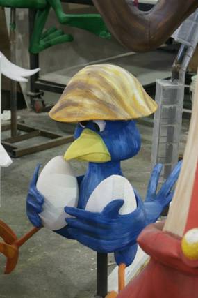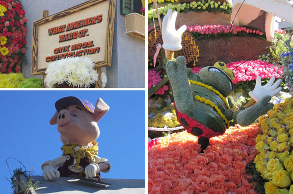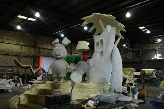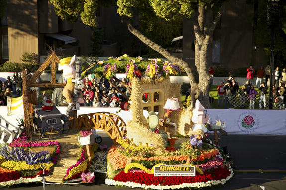 Our float, designed by John Ramirez, is a fun play off the story of the little three pigs. As the fairy tale goes the three little pigs build their homes with the intention of keeping out the Big Bad Wolf. The first little pig builds his house out of straw, the second little pig builds his house out of sticks and the Big Bad Wolf blows both houses down. The third little pig builds his house out of QUIKRETE® Concrete Mix and thus out-smarts the Big Bad Wolf. His dream home is safe thanks to QUIKRETE®.